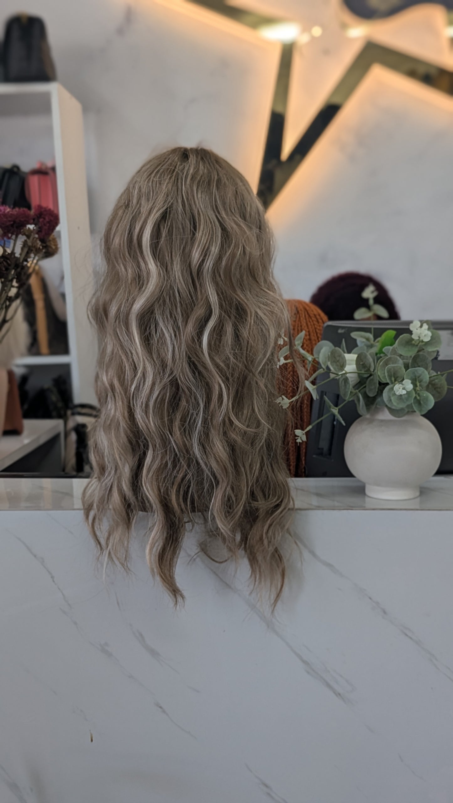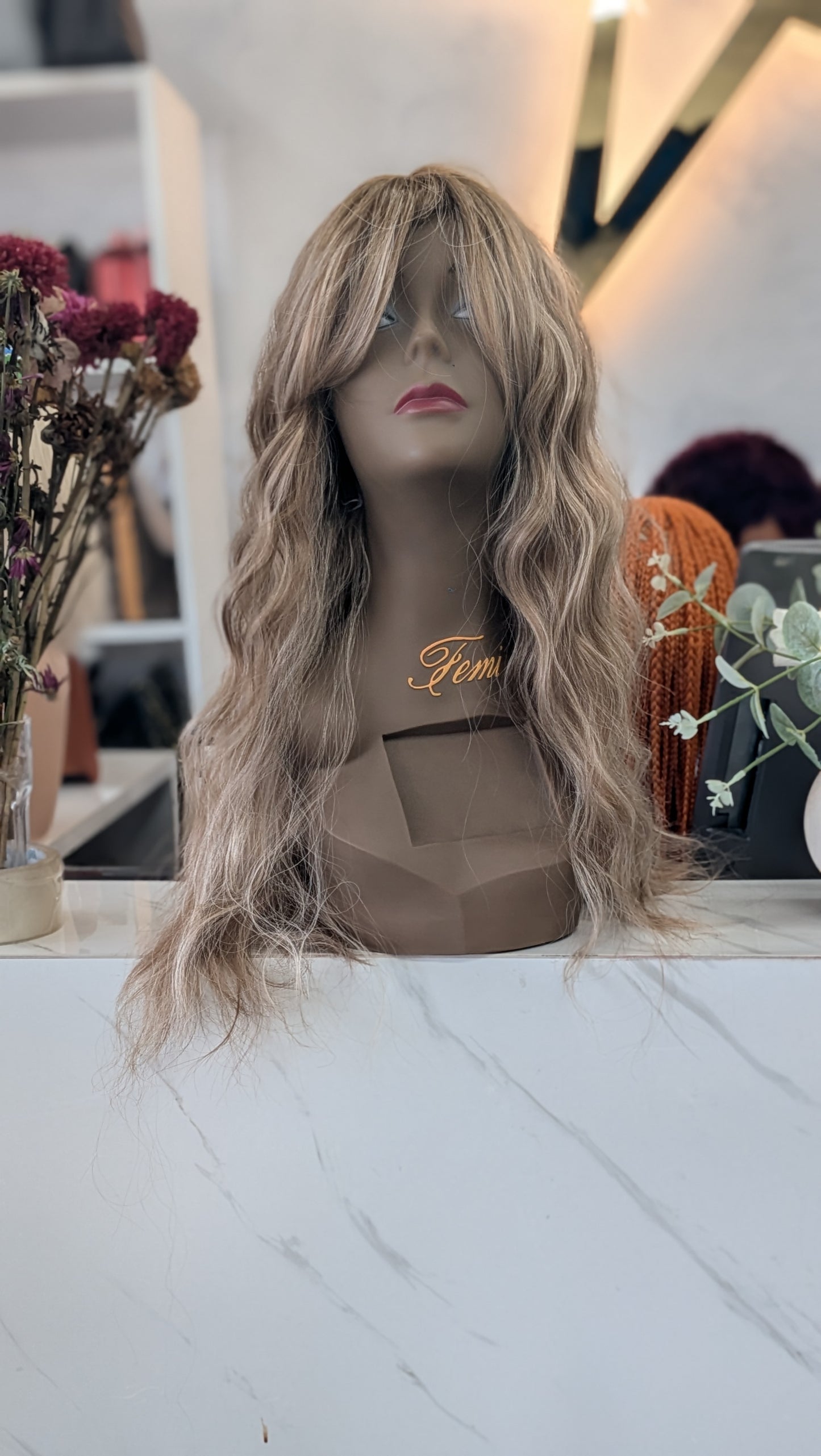 Add light golden brown long sassy curls center parted to the cart