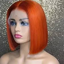 Regular price $400.00This vibrant short bob wig is made from premium quality human hair, ensuring a natural and realistic look. Perfect for adding a pop of color to any outfit or occasion. With its comfortable fit and easy maintenance, this wig is a must-have for any wig lover!This is a short, straight bob wig in an intense, vivid tangerine or bright orange color. The wig is styled with a sleek, blunt cut that falls around the chin or jawline. The hair appears smooth and well-maintained. On the mannequin head, it is shown as a center-part style, and the front view suggests it is a lace front wig, allowing for a more natural-looking hairline. This bold color is ideal for making a striking fashion statement or for a costume/cosplay look.