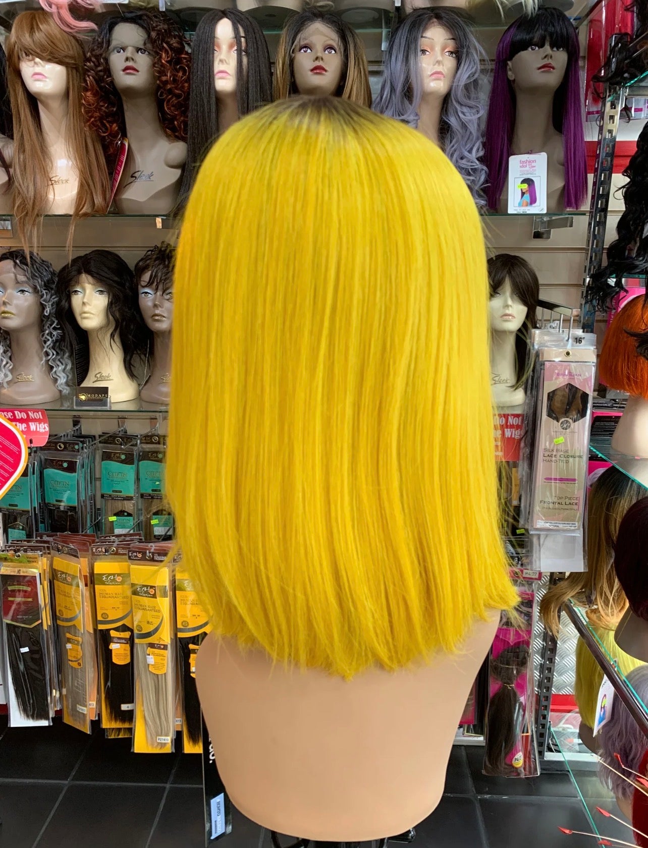 Expertly crafted with 100% human hair, the Yellow Rooted Bob Wig offers a natural and realistic appearance. Say goodbye to synthetic wigs and embrace the softness, durability, and versatility of real hair. Elevate your style with this high-quality wig.This is a short, straight wig that is cut evenly around the head (a bob style). The color is a very bright, intense yellow(neon yellow). It has darker hair at the top (dark roots), which makes the bright yellow color stand out even more.