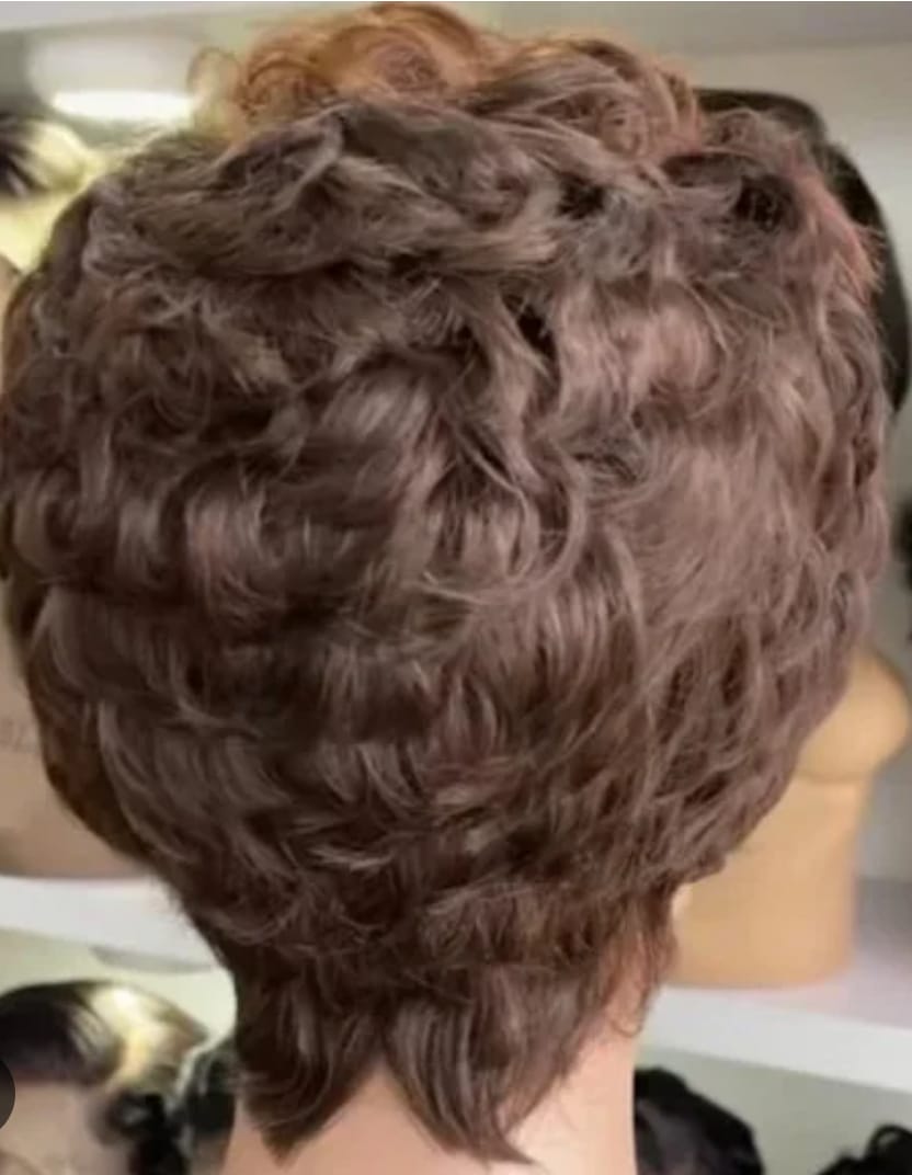 Expertly designed for a natural look, the Short Curly Tapered Wig in Brown is made with high-quality human hair. With its precise cut and beautiful curls, this wig provides a realistic and stylish option for those looking to change up their hairstyle. Experience the benefits of human hair in a convenient and fashionable way.A short, curly wig with a tapered back and layered texture for a more modern, shapely style. The curls are fuller on top and gradually narrow toward the nape, creating a natural and flattering profile. This style is great for adding effortless volume while keeping a clean, refined finish. The warm brown tone gives it a natural, realistic look.